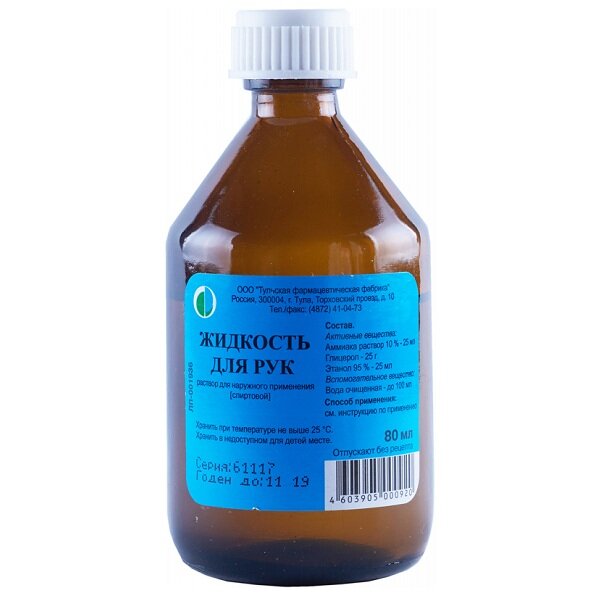 100 мл раствора содержат: Действующие вещества: аммиака раствор 10 % - 25 мл, глицерол – 25 г, этанол 95 % - 25 мл. Вспомогательное вещество: вода очищенная – до 100 мл.