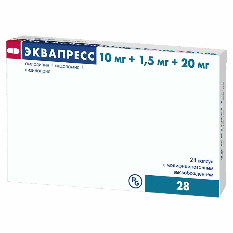 Эквапресс® - фиксированная комбинация антигипертензивных компонентов амлодипина, индапамида и лизиноприла, которые обладают взаимодополняющими механизмами действия, позволяющими контролировать АД, а также синергично оказывают кардиопротекторное действие. Комбинация амлодипина, индапамида и лизиноприла позволяет предотвратить возможное развитие побочных эффектов, возникающих при назначении отдельных компонентов препарата. Например, расширяя артериолы, блокаторы медленных кальциевых каналов (БМКК) могут вызывать задержку натрия и жидкости в организме, что приводит к активации РААС. Ингибитор АПФ блокирует этот процесс и нормализует ответ организма на солевую нагрузку. Ингибиторы АПФ значительно снижают гипокалиемию, вызванную диуретиками. Амлодипин Производное дигидропиридина - блокатор медленных кальциевых каналов, который оказывает антигипертензивное и антиангинальное действие. Блокирует медленные кальциевые каналы, снижает трансмембранный переход ионов кальция в клетку (в большей степени в гладкомышечные клетки сосудов, чем в кардиомиоциты). Антиангинальное действие обусловлено расширением коронарных и периферических артерий и артериол: при стенокардии уменьшает выраженность ишемии миокарда; расширяя периферические артериолы, снижает ОПСС, уменьшает постнагрузку на сердце, снижает потребность миокарда в кислороде; расширяя коронарные артерии и артериолы в неизмененных и в ишемизированных зонах миокарда, увеличивает поступление кислорода в миокард (особенно при вазоспастической стенокардии); предотвращает спазм коронарных артерий (в т.ч. вызванный курением). У пациентов со стабильной стенокардией однократная суточная доза увеличивает толерантность к физической нагрузке, замедляет развитие приступов стенокардии и депрессии сегмента ST, снижает частоту приступов стенокардии и потребления нитроглицерина и других нитратов. Оказывает длительное дозозависимое антигипертензивное действие. Антигипертензивное действие обусловлено прямым вазодилатирующим влиянием на гладкие мышцы сосудов. При артериальной гипертензии разовая доза обеспечивает клинически значимое снижение АД на протяжении 24 ч (в положении лежа и стоя). Ортостатическая гипотензия при применении амлодипина встречается достаточно редко. Амлодипин не вызывает снижения толерантности к физической нагрузке, фракции выброса левого желудочка. Уменьшает степень гипертрофии миокарда левого желудочка. Не оказывает влияния на сократимость и проводимость миокарда, не вызывает рефлекторного увеличения ЧСС, тормозит агрегацию тромбоцитов, увеличивает скорость клубочковой фильтрации, обладает слабым натрийуретическим действием. При диабетической нефропатии не увеличивает выраженность микроальбуминурии. Не оказывает какого-либо неблагоприятного влияния на обмен веществ и концентрацию липидов плазмы крови и может применяться при терапии пациентов с бронхиальной астмой, сахарным диабетом и подагрой. Значимое снижение АД наблюдается через 6-10 ч, длительность эффекта - 24 ч. У пациентов с заболеваниями сердечно-сосудистой системы (включая коронарный атеросклероз с поражением одного сосуда и до стеноза 3 и более артерий, атеросклероз сонных артерий), перенесших инфаркт миокарда, чрескожную транслюминальную коронарную ангиопластик