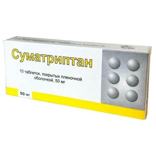 Действующее вещество: суматриптана сукцинат 70 мг , в пересчете на суматриптан 50 мг. Вспомогательные вещества: целлюлоза микрокристаллическая тип 101 - 18 мгг, лактозы моногидрат 62,1 мг г, повидон К-30 3,3 мг, карбоксиметилкрахмал натрия (натрия крахмал гликолят, примогель) 5 мг г, магния стеарат 1,6 мг ;