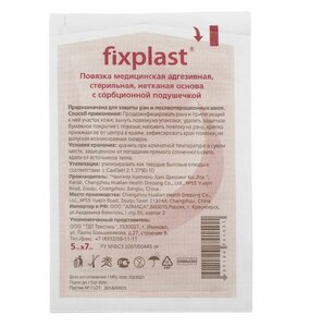 Повязка Fixplast медицинская адгезивная с сорбционной подушечкой на нетканой основе 7 х 5 см