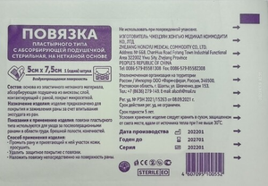 Повязка пластырного типа с адсорбирующей подушечкой стерильная 5 х 7.5 см