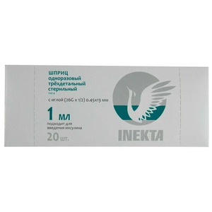 Шприц Inekta 3-х компонентный стерильный с иглой 26G х 1/2 0.45 х 13 мм 1 мл 20 шт.