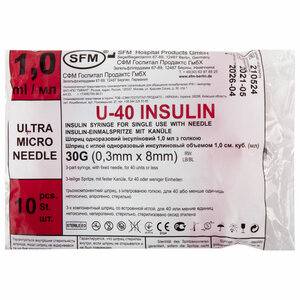 Шприц инсулиновый SFM U-40 3-х компонентный с иглой 30G 0.3 х 8 мм 1 мл х 10 шт.