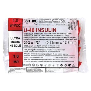 Шприц инсулиновый SFM U-40 3-х компонентный 29G 0.33 х 12.7 мм 1 мл 10 шт.