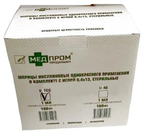 Шприц инcулиновый Медпром Продакшен U-100 с иглой 0.4 х 13 мм 1 мл 100 шт.