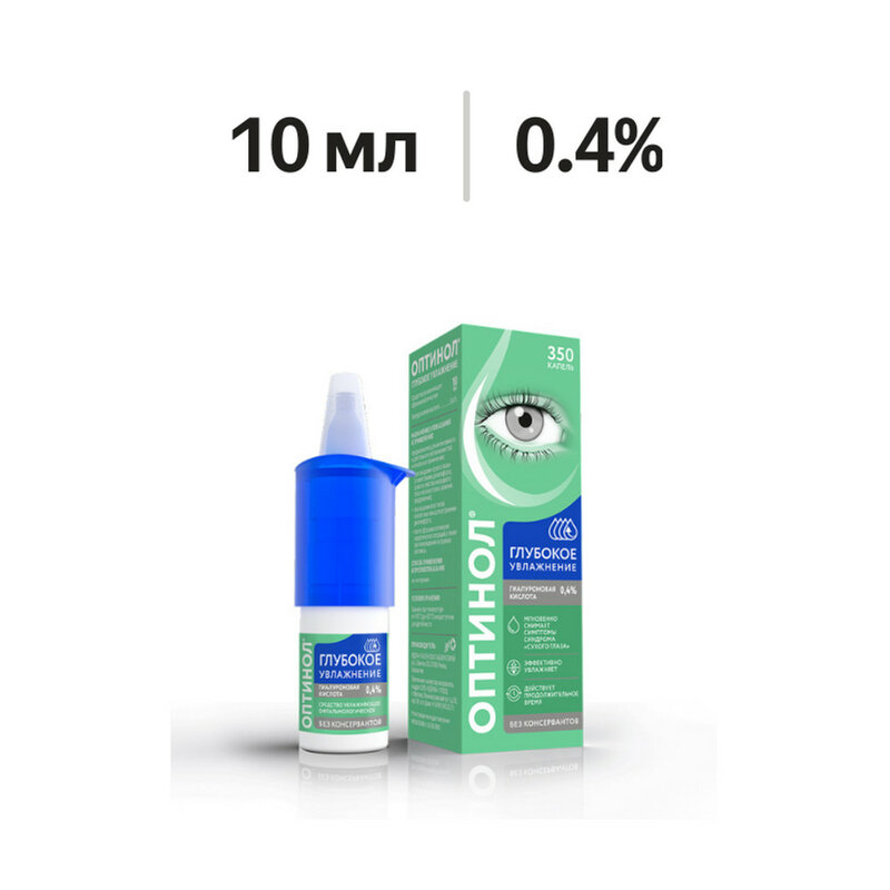 Отсутствие консервантов и наличие такого компонента, как природное увлажняющее вещество гиалуроновая кислота (в виде натриевой соли), обеспечивает хорошую переносимость «Оптинол» Глубокое увлажнение даже при длительном применении.