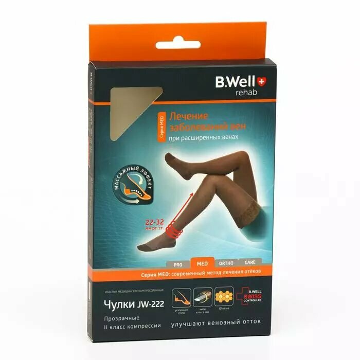 Чулки компрессионные с ажурным верхом B.Well rehab JW-222, 2 класс компрессии (22-32 мм рт. ст.) для улучшения венозного оттока при заболеваниях вен, хронической венозной недостаточности, для профилактики тромбоза глубоких вен.
