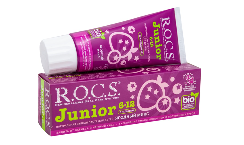 Зубная паста R.O.C.S. Junior Ягодный микс детская 74г разработана специально для детей в возрасте от 6 до 12 лет. В этот период молочные зубы меняются на постоянные, поэтому полость рта нуждается в особом уходе. Паста способствует укреплению зубной эмали и препятствует возникновению кариеса. Двойной экстракт осиновой коры и ксилит защищают зубы и десны от воспаления и подавляют активность патогенных бактерий. Минеральный комплекс укрепляет эмаль и усиливает белизну зубов. Продукт не содержит фтора, SLS парабенов и прочих агрессивных компонентов, поэтому безопасен при случайном проглатывании. Паста обладает приятным ягодным вкусом, а тюбик выполнен в привлекательном для детей дизайне, поэтому регулярная чистка зубов будет приносить вашему ребенку только положительные эмоции!
