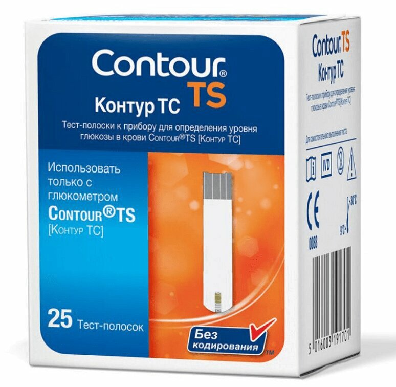 Тест-полоски Контур ТС предназначены для проведения самостоятельного измерения уровня глюкозы в крови. Система Контур ТС имеет ряд особенностей, которые обеспечивают получение точного результата легко: 1) Точность системы соответствует требованиям действующего международного стандарта ISO 15197:20131. 2) Для анализа требуется маленькая капля крови всего 0.6 мкл - ее будет достаточно для получения точного результата. Капиллярный забор крови - тест-полоска сама втягивает небольшое количество крови. 3) Система использует современный электрохимический метод измерения, который обеспечивает получение точных результатов без влияния уровня освещенности. 4) Современный стабильный фермент - можно использовать тест-полоски в течение всего срока годности независимо от момента, когда упаковка тест - полосок была открыта. 5) В системе используется технология "Без кодирования". Данная технология позволяют прибору каждый раз, когда вставляется тест-полоска, кодироваться автоматически, тем самым устраняется необходимость ручного ввода кода - частого источника ошибок. Таким образом предотвращаются ошибки, связанные с неправильным введением кода. Не нужно тратить время на ввод кода или кодового чипа/полоски. Тест-полоски Контур ТС представляют собой пластиковые полоски размером 5 на 28 мм, с системой электродов на одном конце и камерой для забора крови - на другом.