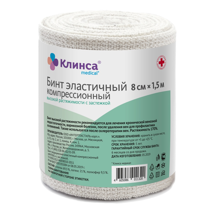 Бинт Клинса эластичный компрессионный высокой растяжимости с застежкой 8 см х 1.5 м