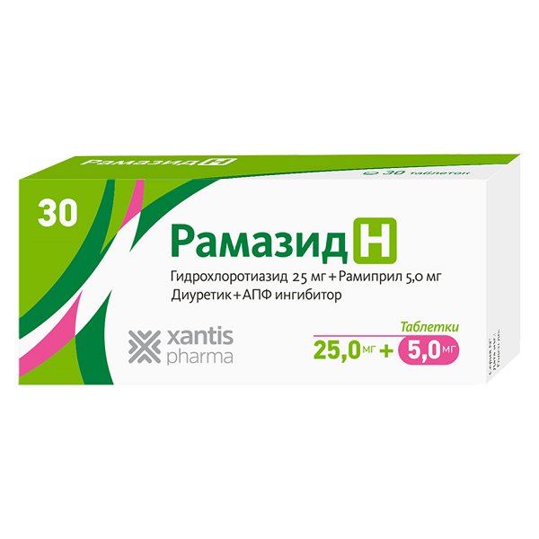 Комбинированный антигипертензивный препарат, в состав которого входит ингибитор АПФ рамиприл и тиазидный диуретик гидрохлоротиазид. Оказывает антигипертензивное и диуретическое действие. Оказывает антигипертензивное и диуретическое действие. Гипотензивный эффект обоих компонентов практически аддитивный. Рамиприл - ингибитор АПФ. Является пролекарством, в организме превращается в активный метаболит рамиприлат, который оказывает ингибирующее действие на АПФ. АПФ катализирует превращение ангиотензина I в тканях в активный вазоконстриктор ангиотензин II, а также распад активного вазодилататора брадикинина. Уменьшение количества ангиотензина II и подавление распада брадикинина приводит к расширению сосудов. Поскольку ангиотензин II также стимулирует выброс альдостерона, рамиприлат приводит к уменьшению выброса альдостерона. Рамиприл уменьшает ОПСС. Прием рамиприла пациентами с артериальной гипертензией снижает АД в положении стоя и лежа без компенсаторного учащения ЧСС. У большинства пациентов антигипертензивный эффект проявляется через 1-2 ч после приема одной дозы. Степень выраженности эффекта достигает максимума через 3-6 ч после приема. Как правило, антигипертензивный эффект после однократного приема сохраняется на протяжении 24 ч. При продолжительном лечении рамиприлом максимальный антигипертензивный эффект обычно достигается через 2-4 недели. Показано, что при долгосрочной терапии антигипертензивный эффект удается поддерживать в течение 2 лет. Резкое прекращение приема рамиприла не приводит к быстрому и чрезмерному повышению АД. Как правило, не наблюдается существенных изменений скорости почечного кровотока и клубочковой фильтрации. Гидрохлоротиазид - тиазидный диуретик, диуретический эффект которого связан с нарушением реабсорбции ионов натрия, хлора, калия, магния, воды в дистальном отделе нефрона; задерживает выведение ионов кальция, мочевой кислоты. Обладает антигипертензивными свойствами; гипотензивное действие развивается за счет расширения артериол. Практически не оказывает влияния на нормальный уровень АД. Выведение электролитов и воды начинается примерно через 2 ч после приема, максимальный эффект достигается за 3-6 ч и сохраняется в течение 6-12 ч. Антигипертензивный эффект достигается за 3-4 дня лечения и длится в течение 1 недели после завершения приема препарата. При длительном лечении снижение АД достигается при использовании меньших доз, чем необходимые для диуретического эффекта. Снижение АД сопровождается небольшим повышением скорости клубочковой фильтрации, сосудистого сопротивления почечного русла и активности ренина в плазме крови. Гидрохлоротиазид при однократном приеме в высоких дозах приводит к уменьшению объема плазмы, СКФ, почечного кровотока и среднего АД. При длительном приеме в малых дозах объем плазмы крови остается сниженным, в то время как минутный объем и скорость клубочковой фильтрации возвращаются к исходному уровню, предшествующему началу лечения. Среднее АД и системное сосудистое сопротивление остаются сниженными. Тиазидные диуретики могут нарушать продукцию грудного молока.