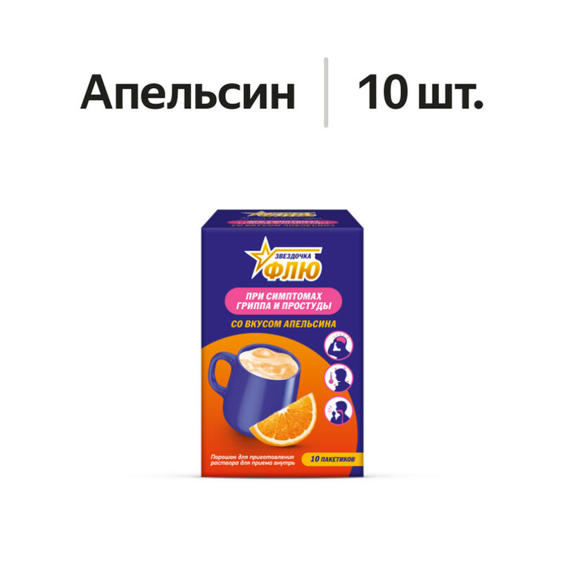 Внутрь. Растворить содержимое одного пакетика в 1 стакане кипяченной горячей воды. Употреблять в горячем виде. Можно добавить сахар по вкусу. Повторную дозу можно принимать через каждые 4 часа (не более 4 доз в течение 24 часов). Звездочку Флю можно применять в любое время суток. Если не наблюдается облегчения симптомов в течение 3 дней после начала приема препарата, необходимо обратиться к врачу.