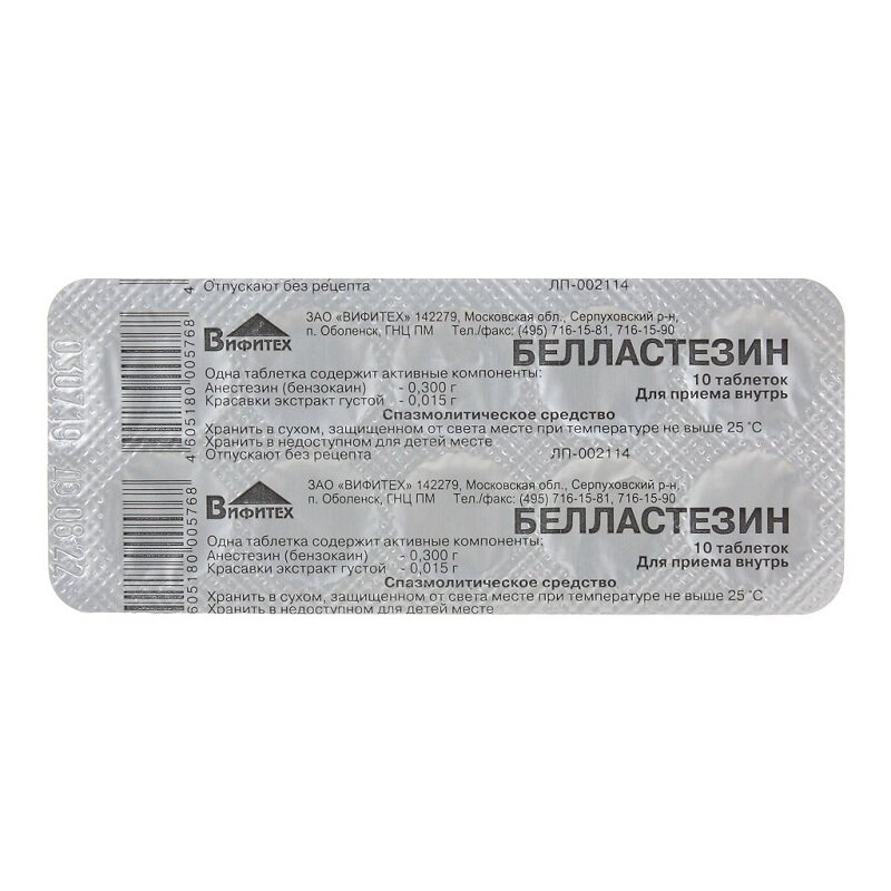 Активные компоненты: Анестезин (бензокаин) 0,300 г, Красавки экстракт густой 0,015 г. Вспомогательные вещества: Целлюлоза микрокристаллическая 0,035417 г, оксипропилцеллюлоза (гипролоза) 0,008510 г, кроскармеллоза натрия 0,003691 г, Тальк 0,003691 г, кальция стеарат 0,003691 г.