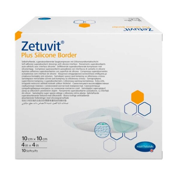 Медицинское изделие Zetuvit Plus Silicone Border/Цетувит плюс силикон бордер состоит из полупроницаемой полиуретановой наружной пленки, перфорированной силиконовой пленки со стороны, контактирующей с раной, и адсорбирующего слоя между этими двумя пленками. Для скрепления этих двух слоев используется акриловый клей. Наружная пленка является воздухопроницаемой, но водонепроницаемой, что позволяет пациенту принимать душ. Перфорированная силиконовая пленка, контактирующая с раной, облегчает фиксацию повязки и предотвращает прилипание повязки к ране. Абсорбирующий слой, изготовленный из целлюлозы и супервпитывающего полиакрилата для абсорбции и удерживания экссудата, обернут в гидрофильную целлюлозную ткань, а также покрыт гидрофобным нетканым материалом зеленого цвета (100%-й полипропилен), что позволяет определить сторону, не контактирующую с раной. С обратной стороны продукт выполнен из очень мягкого белого гидрофильного нетканого материала (вискоза и полиамид).