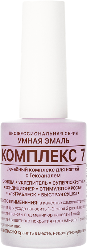 этил ацетат, бутил ацетат, изопропиловый спирт, нитроцеллюлоза, тозиламид/формальдегидная смола, триметил пентанил диизобутират, бутиловый спирт, акриловый сополимер, вода, бензофенон-1, аминокислоты кератина, сафлоровое масло и экстракт женьшеня, алоэ вера, витамин Е, соевый протеин, диметикон, пантотенат кальция, аскорбиновая кислота, витамин В, хлорид натрия, гидролизованный коллаген, CI 60725