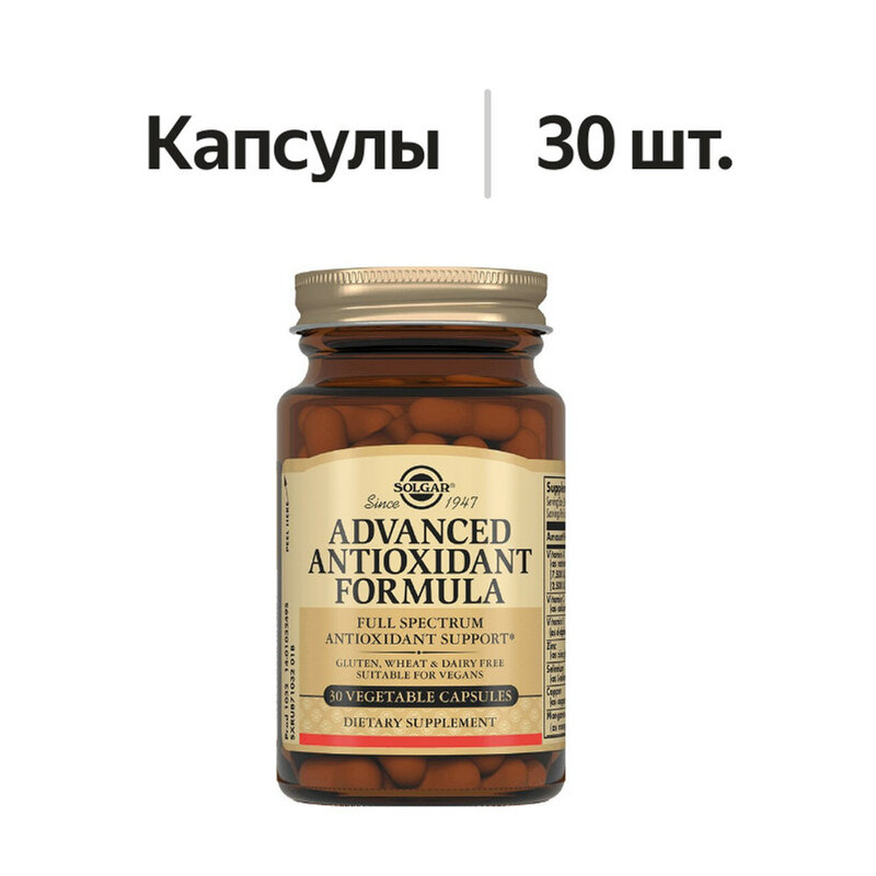 Solgar Advanced antioxidant formula обеспечивает комплексную защиту организма от негативного воздействия свободных радикалов, провоцирующих старение.