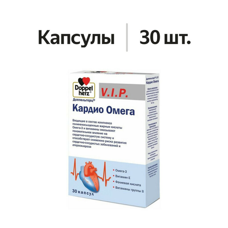 Входящие в состав Доппельгерц V.I.P. Кардио Омега полиненасыщенные жирные кислоты Омега-3 и витамины оказывают положительное влияние на сердечно-сосудистую систему и способствуют снижению риска развития сердечно-сосудистых заболеваний и атеросклероза.Препарат Доппельгерц V.I.P. Кардио Омега может использоваться:для снижения риска развития сердечно-сосудистых заболеваний и атеросклероза;для снижения уровней триглицеридов и общего холестерина в крови (особенно у больных сахарным диабетом и метаболическим синдромом с целью их профилактики);для нормализации липидного обмена и улучшения соотношения между ЛПВП и ЛПНП (особенно у больных сахарным диабетом и метаболическим синдромом с целью их профилактики);с целью улучшения кровоснабжения сердечно-сосудистой системы;для улучшения мозгового кровообращения и работы мозга;для повышения иммунитета;витамин Е обеспечивает защиту клеток от токсического воздействия свободных радикалов (антиоксидантный эффект).