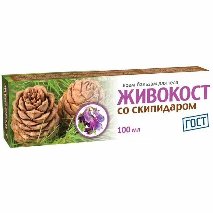 Живокост крем-бальзам для тела со скипидаром содержит следующие компоненты: экстракт живокоста, масло ши, скипидар, камфору, масло расторопши, ментол, экстракт коры ивы, экстракт лопуха, экстракт сабельника, экстракт прополиса, хондроитина сульфат, глюкозамина гидрохлорид, масло найоли, масло майорана, масло сосны, витамин Е, экстракт адамова корня. Крем-бальзам Живокост со скипидаром рекомендуется как вспомогательное средство при лечении заболеваний суставов: остеохондрозе, радикулите, артрозе, артрите, подагре. Живокост стимулирует восстановление поврежденных тканей, снимает отечность и мышечный спазм, ускоряет процессы восстановления при переломах, растяжениях и ушибах. Скипидар живичный оказывает обезболивающее и противовоспалительное действие, обладает сильным раздражающим действием, усиливает кровоснабжение тканей в месте нанесения крем-бальзама.