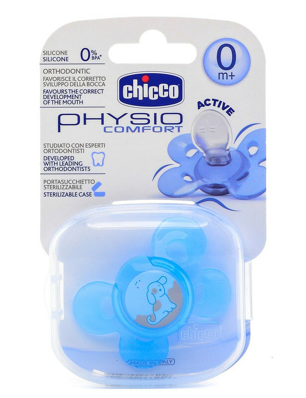 Для красивой улыбки очень важно подобрать хорошую пустышку. Специально для этого дизайнеры Chicco совместно с ведущими ортодонтами разработали серию Physio Comfort. Эту пустышку с милым рисунком можно использовать с рождения. Эргономичная форма и специальные отверстия на щитке способствуют облегчению дыхания. Сделана из силикона — материала, который не имеет ни вкуса, ни запаха. Пустышка удовлетворяет естественный сосательный рефлекс малышей