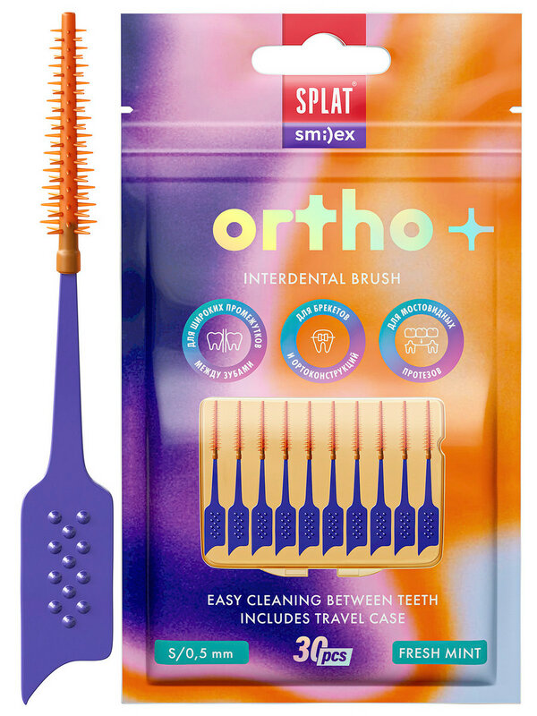Ершик Splat Smilex Ortho+ межзубный с эластичным кончиком со вкусом мяты Размер S Мягкий 30 шт Межзубный ершик с эластичным покрытием позволяет мягко удалять налет и остатки пищи .Ручка ершиков имеет заостренный наконечник, который можно безопасно использовать вместо зубочистки для очищения глубоких фиссур. А после его применения свежее дыхание гарантировано! Состав: ручка - полипропилен, термопластичный эластомер, ароматизатор «Мята» Рекомендации по применению/Способ применения: Проведите ершиком под прямым углом очень мягко между зубами. Движениями вперед-назад, очистите межзубное пространство. Не прилагайте слишком больших усилий при чистке — это может повредить зубы.