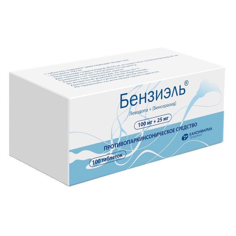 Внутрь, не менее чем за 30 мин до или через 1 ч после еды, таблетки можно размельчать для облегчения глотания. Болезнь Паркинсона Стандартный режим дозирования Лечение следует начинать с малой дозы, постепенно увеличивая дозу для каждого пациента индивидуально до достижения терапевтического эффекта. Начальная терапия На ранней стадии болезни Паркинсона рекомендуется начинать лечение препаратами леводопы/бенсеразида с приема 62,5 мг (50 мг леводопы + 12,5 мг бенсеразида) 3-4 раза в сутки. При переносимости схемы начального дозирования дозу нужно медленно увеличивать в зависимости от реакции пациента. Оптимальный эффект обычно достигается при суточной дозе в 300-800 мг леводопы + 75-200 мг бенсеразида, принимаемой в три или более приемов. Для достижения оптимального эффекта может потребоваться от 4 до 6 недель. При необходимости дальнейшего увеличения суточной дозы это следует делать с промежутками в 1 месяц. Поддерживающая терапия Средняя поддерживающая доза - 125 мг (100 мг леводопы +- 25 мг бенсеразида) 3-6 раз в сутки. Число приемов (не менее трех) и их распределение в течение дня должно обеспечить оптимальный эффект. Синдром "беспокойных ног" Максимально допустимая доза в сутки - 500 мг препарата Бензиэль® (400 мг леводопы + 100 мг бенсеразида). За 1 ч до сна с небольшим количеством пищи. Перед применением препарата Бензиэль® следует воздержаться от приема пищи, богатой белком. Идиопатический синдром "беспокойных ног" с нарушениями засыпания Начальная доза препарата Бензиэль®: 62,5 мг (50 мг леводопы + 12,5 мг бенсеразида) - 125 мг (100 мг леводопы + 25 мг бенсеразида). При недостаточном эффекте следует увеличить дозу препарата до 250 мг (200 мг леводопы + 50 мг бенсеразида). Идиопатический синдром "беспокойных ног" с нарушениями засыпания и сна Начальная доза препарата Бензиэль®: 125 мг (100 мг леводопы + 25 мг бенсеразида). При недостаточном эффекте рекомендуется увеличить дозу препарата до 250 мг (200 мг леводопы + 50 мг бенсеразида). Идиопатический синдром "беспокойных йог" с нарушениями засыпания и сна, а также с нарушениями в течение суток Дополнительно: 125 мг (100 мг леводопы + 25 мг бепсеразида), максимально допустимая суточная доза - 500 мг (400 мг леводопы + 100 мг бепсеразида) препарата Бензиэль®. Синдром "беспокойных ног" у пациентов с хронической почечной недостаточностью, получающих диализ 125 мг препарата Бензиэль® (100 мг леводопы + 25 мг бепсеразида) за 30 минут до начала диализа. Дозирование в особых случаях Болезнь Паркинсона Препарат Бензиэль® можно комбинировать с другими противопаркинсоническими средствами, по мере продолжения лечения может возникнуть необходимость в уменьшении дозы других препаратов или их постепенной отмене. У пациентов с почечной недостаточностью легкой или умеренной степени тяжести коррекции дозы не требуется. Препарат Бензиэль® хорошо переносится пациентами, находящимися на гемодиализе. При длительном лечении возможно появление флюктуаций - эпизодов "застывания", ослабления эффекта к концу периода действия дозы, феномена "включения-выключения". Для устранения этих симптомов пли уменьшения их выраженности следует провести коррекцию дозы, возможно, путем назначения меньших доз, но чаще. Впоследствии можно попробовать вновь увеличить дозу для усиления терапевтического эффекта. Синдром "беспокойных ног" Для исключения нарастания симптомов с