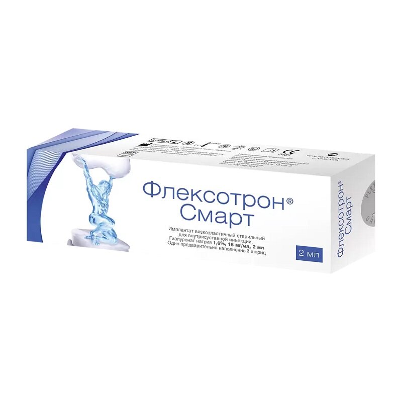 Гиалуроновая кислота представляет собой поли-(2-ацетамидо-2-дезокси-D-глюко)-D-глюкуроногликан, то есть полимер, состоящий из остатков D-глюкуроновой кислоты и N-ацетил-D-глюкозамина, соединённых поочерёдно β-1,4- и β-1,3-гликозидными связями. Благодаря такой полимерной трехмерной структуре формируются крупные отрицательно заряженные агрегаты, удерживающие воду. Эти агрегаты отвечают за влагосодержание, упругость и эластичность хрящевой ткани (устойчивость её к компрессии). Внутрисуставное обогащение синовиальной жидкости инъекциями гиалуроната натрия способствует улучшению или восстановлению вязкоупругих свойств естественной синовиальной жидкости. Гиалуронат натрия отвечает за вязкоупругие свойства синовиальной жидкости, таким образом вязкоэластичное протезирование позволяет компенсировать недостаточность гиалуроновой кислоты в синовиальной жидкости или снижение её вязкости, смягчить внешние нагрузки на сустав, обеспечивает смазывание, восстановление упругости и вязкости, амортизацию, увлажнение и обволакивание суставных поверхностей, покрывая смазывающим защитным слоем хрящ и рецепторы синовии. Это помогает увеличить объём движений и обеспечивает механическую защиту тканей полости сустава, что в свою очередь может улучшать течение остеоратроза / остеоартрита и других дегенеративно-дистрофических и посттравматических патологий суставов. На основании клинических сведений об особенностях биодеградации и продолжительности лечебных эффектов внутрисуставного введения гиалуроновой кислоты предполагается, что биодеградация каждого варианта исполнения вязкоэластичного имплантата "Флексотрон" происходит в срок от 12 до 24 недель. Клинический эффект лечения сохраняется в течение не менее 6 месяцев.