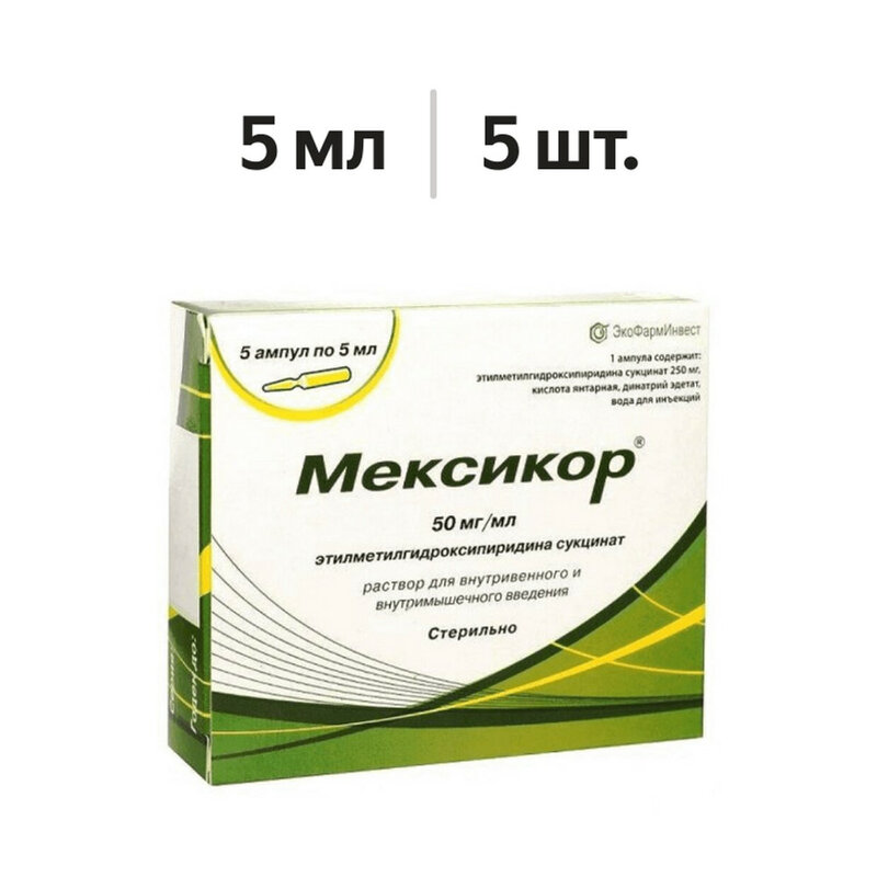 1 мл содержит: этилметилгидроксипиридина сукцинат 50 мг. Вспомогательные вещества: янтарная кислота - 5 мг, динатрия эдетат - 0.1 мг, вода д/и - до 1 мл.