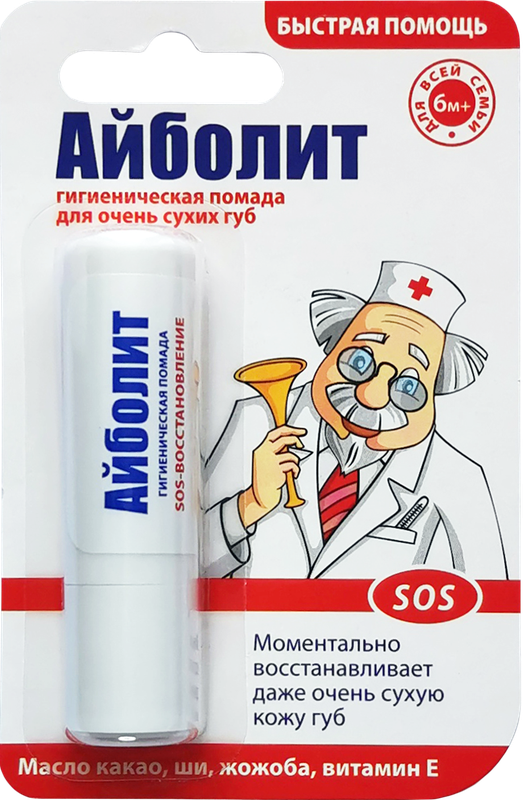 Гигиеническая помада "SOS-восстановление", Айболит, моментально восстанавливает даже очень сухую кожу губ, успокаивает, питает и смягчает её. Содержит масла ши, какао, жожоба, витамин Е. Без минеральных масел, парафина, консервантов, красителей и отдушек. Масса нетто: 2,8 г.