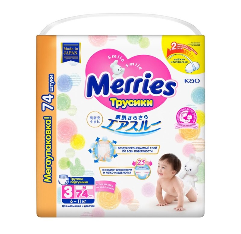 Подгузники-трусики Merries для детей размер M/3 6-11 кг 74 шт созданы с особенной заботой о коже и комфорте вашего ребёнка. Идеально подойдут малышу, который активно ползает, делает первые шаги и исследует мир вокруг. Анатомический крой, учитывающий все особенности растущего малыша, обеспечивает комфорт и свободу движений. Трусики легко снимать, надевать и удобно носить. Они хорошо сидят на талии, не сползают, не жмут и не оставляют следов на нежной коже. Можно использовать как дневные подгузники, когда ребёнок максимально подвижен, так и в качестве ночных подгузников, когда малыш дольше не переодевается. Удлинённый впитывающий слой в задней части трусиков предотвращает протекание, когда ребёнок долго лежит на спине. Оборочки нежно облегают ножки и не образуют щелей, даже если ребёнок много ворочается. Гипоаллергенные материалы не вызывают раздражений, опрелостей и дискомфорта. Полимерный абсорбент отлично впитывает большое количество жидкости, превращает её в гель и защищает от протеканий даже при значительном надавливании. Гладкая, шелковистая поверхность из тончайших волокон максимально сокращает трение при движении малыша. Обновлённая технология трёх воздухопроницаемых слоёв сохраняет кожу малыша сухой и здоровой, обеспечивая свободное выведение прелого воздуха из подгузника. Внутренняя поверхность трусиков остаётся удивительно мягкой для кожи и не прилипает даже после того, как впитает большой объём жидкости. Трёхполосный индикатор меняет цвет, когда трусики пора заменить на новые. Мягкий эластичный поясок не давит на животик и растягивается в 2,5 раза. Ультразвуковой метод соединения боковых швов делает шов более мягким. Теперь при смене подгузника он разрывается ещё легче, а при ношении трусиков не ощутим для малыша. Эластичная лента для утилизации растягивается в 2 раза и надёжно фиксирует даже переполненный подгузник. Более широкий впитывающий слой по всей области между ножек не позволяет жидкости скапливается в одном месте, поэтому трусики не сбиваются в комок, не провисают и не создают дискомфорта, даже когда они уже наполнены. Трусики Merries подходят для девочек и для мальчиков. Не требуют использования защитных кремов и присыпок.