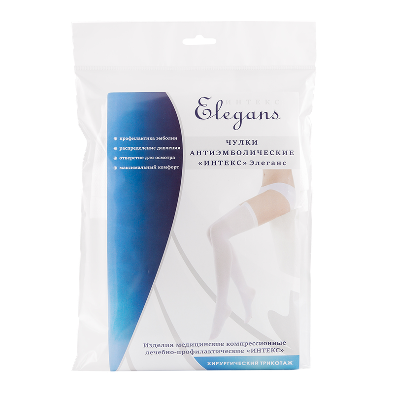 Антиэмболические госпитальные чулки Интекс Элеганс 1 класс компрессии (18-21 мм. рт. ст.) идеально подходят для профилактики тромбозов и тромбоэмболии артерий во время хирургических операций и родов, а также у лежачих больных. Медицинские ортопедические чулки выпускаются только в белом цвете (по санитарно-гигиеническим нормам медучреждений). Противоварикозные чулки имеют специальное отверстие в области стопы для лучшей вентиляции кожи и наблюдения за состоянием кровообращения, не снимая чулок. Противоэмболические чулки имеют надежную резинку с силиконовой лентой. Профилактическое ношение компрессионного белья поможет сохранить здоровье. Резинка не пришивается к изделию, а вывязывается вместе с антиварикозными чулками, это полностью исключает отрыв резинки при надевании чулок. Эластичные противоварикозные компрессионные чулки входят в рекомендуемые товары для беременных женщин с собой в роддома. Операционные послеродовые чулки женские 1 степени помогут избежать риска появления варикоза, растяжения стенок вен, тромбофлебита. Компрессионный трикотаж чулки родовые рассчитаны на кратковременное, не более 14 дней, использование во время пребывания в стационаре, непосредственно во время операции (например, кесарево сечение) или родов, и непродолжительное время в послеродовой период после выписки из роддома. Компрессионная одежда рекомендована к послеоперационной реабилитации с целью нормализации кровообращения в области конечностей.