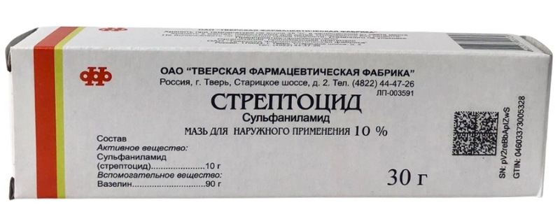 на 100 г Активное вещество: Сульфаниламид (стрептоцид) - 10 г. Вспомогательное вещество: Вазелин - 90 г.