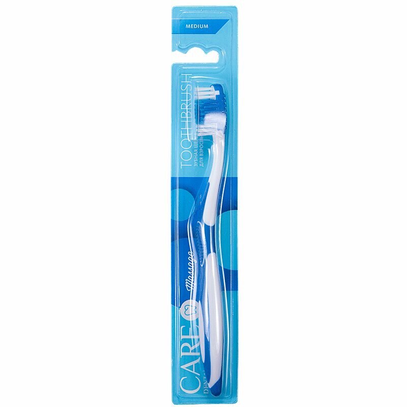 Зубная щетка для взрослых. Средняя жесткость. Мягкие резиновые щетинки нежно массируют десны, стимулируя кровообращение. Удобная и эргономичная ручка с резиновыми накладками предотвращает скольжение щетки в руке и обеспечивает удобство использования.
