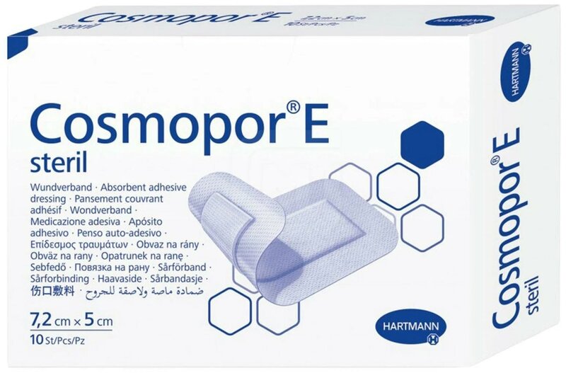 Повязки пластырного типа стерильные Cosmopor E Steril/Космопор Е стерил, размер 7,5х5 см - стерильная самоклеящаяся повязка на рану с впитывающей подушечкой для ран с умеренной экссудацией, каждая повязка упакована индивидуально. Упаковка содержит 10 повязок. Мягкий, воздухопроницаемый, нетканый материал обеспечивает высокий комфорт при использовании и препятствует мацерации кожи вокруг раны. Эти повязки имеют высокую впитывающую способность и быстро впитывают кровь и экссудат, что способствует быстрому заживлению тканей. Специальная микросетка на впитывающей подушечке препятствует присыханию повязки к ране, и ее смена проходит безболезненно. Закругленные края повязки позволяют ей крепко держаться и не отклеиваться. Применяется в таких случаях, как: послеоперационное ведение ушитых ран, для защиты ран после медицинских процедур (дезинфекция, очищение раны и т.д.); стерильного ухода при поверхностных повреждениях кожи (порезы, ссадины, потертости и т.д.), первой помощи; абсорбции экссудата у ран с умеренным отделяемым; фиксации атравматических повязок. Смена повязки происходит в индивидуальном режиме, но не реже, чем один раз в три дня.