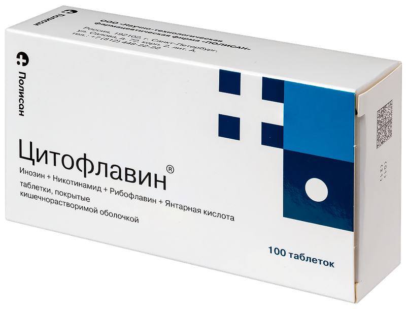 Таким образом, все компоненты препарата Цитофлавин® являются естественными метаболитами организма и стимулируют тканевое дыхание. Метаболическая энергокоррекция, антигипоксическая и антиоксидантная активность препарата, определяющие фармакологические свойства и лечебную эффективность составляющих, обусловлена взаимодополняющим действием янтарной кислоты, инозина, никотинамида и рибофлавина.