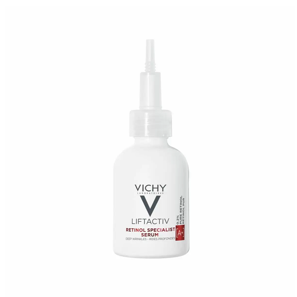 C возрастом и вследствие воздействия факторов внешней среды, сокращается клеточное обновление кожи, морщины становятся более глубокими и заметными. Инновация от VICHY: новая сыворотка RETINOL SPECIALIST ДЛЯ КОРРЕКЦИИ ГЛУБОКИХ МОРЩИН обогащена 0,2% чистым ретинолом усиленным фракциями пробиотика и био-пептидами для интенсивного антивозрастного действия. Борется со всеми типам морщин, даже с глубокими. Клинически доказанная эффективность. Сокращает все виды морщин, даже глубокие: морщины на лбу, межбровные морщины, морщины в уголках глаз, носогубные складки, морщины в уголках губ, птоз нижней части лица.