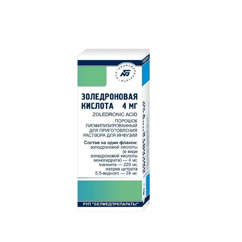 Действующее вещество: золедроновой кислоты моногидрат - 4.26 мг, что соответствует содержанию золедроновой кислоты - 4 мг. Вспомогательные вещества: маннитол - 220 мг, натрия цитрата пентасесквигидрат (в пересчете на безводное вещество) - 24 мг.