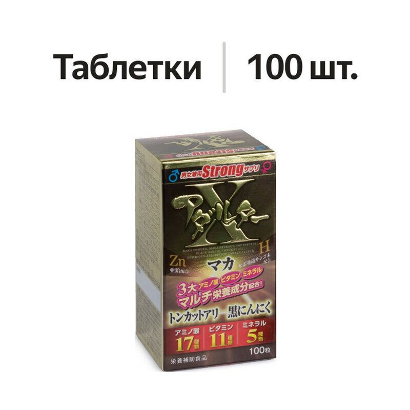 На 4 таблетки: порошок маки перуанской - 200 мг, кальций из панцирей моллюсков - 39,48 мг, L-глутамин - 29,4 мг, экстракт маки перуанской в порошке - 20,04 мг, дрожжи, обогащенные цинком - 20,04 мг, L-пролин - 19,92 мг, витамин С - 19,56 мг, L-лейцин - 19,08 мг, L-валин - 15 мг, L-аргинин - 14,52 мг, L-изолейцин - 14,4 мг, L-лизин моногидрохлорид - 12,6 мг, порошок черного чеснока - 12 мг, порошок Тонгкат Али (эврикомы длиннолистой) - 12 мг, L-фенилаланин - 11,4 мг, L-аланин - 11,28 мг, L-глицин - 10,44 мг, дрожжи, обогащенные магнием - 9,84 мг, L-треонин - 9,84 мг, L-тирозин - 7,44 мг, L-гистидин - 7,08 мг, L-цистин - 5,64 мг, L-триптофан - 5,52 мг, L-метионин - 5,4 мг, рожжи, обогащенные железом - 4,2 мг, дрожжи, обогащенные медью - 3,6 мг, витамин В3 - 2,44 мг, витамин E - 1,77 мг, витамин В5 - 1,47 мг, коралловый кальций - 1,2 мг, бета-каротин - 1,044 мг, витамин B1 - 0,24 мг, витамин B2 - 0,24 мг, витамин B6 - 0,219 мг, витамин A - 0,129 мг, фолиевая кислота - 0,128 мг, витамин D3 - 0,012 мг, витамин B12 - 0,005 мг