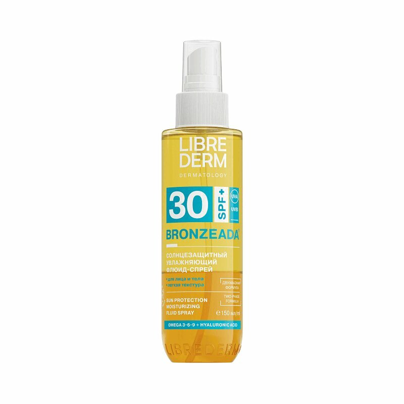 LIBREDERM (Либридерм) - международный бренд косметики, который предлагает современные решения для любой дерматологической потребности. Линия БРОНЗИАДА [BRONZEADA] - коллекция солнцезащитных средств BRONZEADA с широким спектром защиты от УФа, УФб и ИК лучей, отвечающих на запросы детей и взрослых. Высокие косметические свойства продуктов и удобные форматы упаковок сделают защиту от солнца легкой и комфортной. Одобрено дерматологами. LIBREDERM BRONZEADA Солнцезащитный увлажняющий двухфазный флюид-спрей SPF 30 . НАЗНАЧЕНИЕ: высокая степень защиты светлой, чувствительной кожи при умеренном и интенсивном солнечном излучении. Подходит для лица и тела. ДЕЙСТВИЕ: обеспечивает эффективную антиоксидантную и фотостабильную защиту кожи от UVA/UVB лучей, способствует созданию однородного оттенка загара. Не оставляет белых следов, липкости и ощущения жирности на коже. АКТИВНЫЕ КОМПОНЕНТЫ: Масло инка-инчи, богатое Омега 3-6-9, и гиалуроновая кислота предохраняют гидролипидную мантию кожи от обезвоживания, смягчают, питают и препятствуют преждевременному старению кожи.