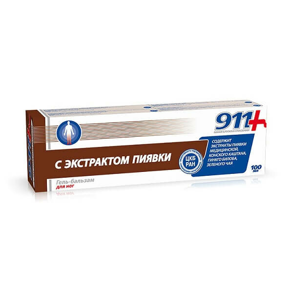 Гель-бальзам косметический с экстрактом пиявки серии «911 Ваша служба спасения» за счет содержания целого комплекса растительных экстрактов, эфирных масел и гесперидина улучшает тонус, снимает усталость и напряжение.