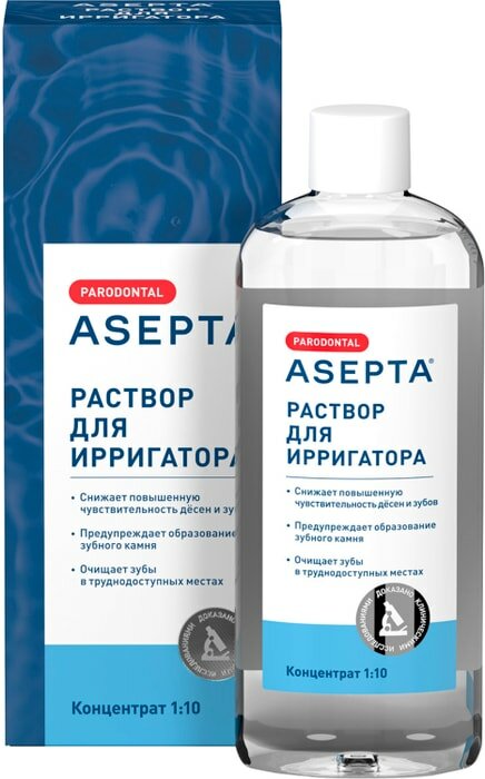 Асепта раствор для ирригатора - концентрированный ополаскиватель с мягким вкусом на основе натуральных экстрактов для ежедневной высокоэффективной гигиены полости рта с помощью ирригатора. Ирригатор улучшает кровообращение и ускоряет процессы регенерации. Эффективен в профилактике кариеса, помогает укрепить дёсны и уменьшить кровоточивость. Рецептура ополаскивателя включает в себя природные экстракты и микроэлементы, которые эффективно удаляют налет, снижают повышенную чувствительность зубов, уменьшают воспаление и способствуют быстрому заживлению микроповреждений. Эффективность средства подтверждена клиническими исследованиями. Использование ирригатора вместе с раствором Асепта существенно повышает качество и эффективность гигиены полости рта, особенно при ношении брекетов и зубных протезов.