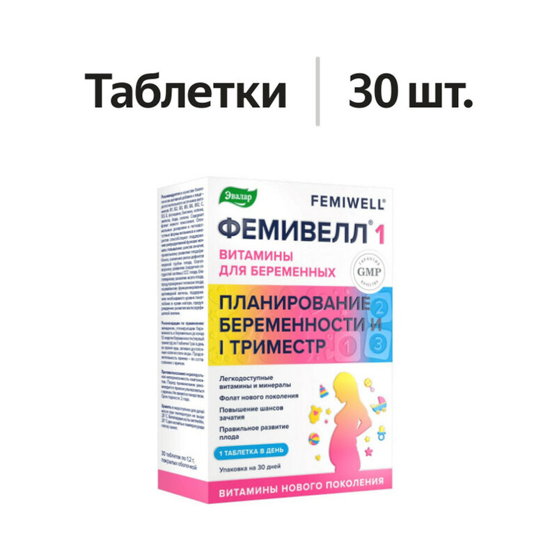 Фолат нового поколения — глюкозаминовая соль (6S)-5-метилтетрагидрофолиевой кислоты — фолат с наивысшей степенью биодоступности для лучшего усвоения. Фолат нового поколения не маскирует дефицит витамина B1. Во время беременности фолиевая кислота расходуется на формирование тканей плода и на восстановление 70 триллионов клеток матери. Кроме того, фолиевая кислота играет важную роль как в формировании ткани плаценты, так и новых кровеносных сосудов в матке. Недостаток фолиевой кислоты в организме матери сказывается на формирующейся у плода с конца 2-й недели беременности нервной системе. При явном дефиците фолиевой кислоты существенно повышается риск развития дефектов нервной трубки, пороков сердца, расщелины верхнего неба и др. Витамины группы B — одни из важнейших витаминов в организме, которые участвуют во многих биологических процессах. Они играют важную роль в развитии плода: в формировании его внутренних органов, развитии его мозга и нервной системы, сердца и печени, его роста, а также стимулируют кроветворение и многое другое. Витамин C необходим для развития и правильной работы плаценты, поддерживает иммунную систему и участвует в выработке коллагена, необходимого для формирования соединительной ткани плода. Витамин D3 необходим для правильного развития плаценты, а также для формирования костной и иммунной систем ребенка. Витамин E — антиоксидант, который защищает клетки от образования свободных радикалов, которые могут стать триггером для различных заболеваний. Он особенно необходим на стадии развития эмбриона, так как участвует в формировании плаценты и предохраняет от прерывания беременности. Биотин необходим для правильного развития эмбриона. Помогает поддержать общее состояние организма, здоровье печени, кожи и нервной системы мамы. Холин (холина битартрат) помогает предотвратить развитие дефектов нервной трубки и способствует развитию головного мозга малыша. Помогает предотвратить повышенное кровяное давление у мамы. Железо (железа бисглицинат) — хелатная форма железа для профилактики анемии. Снижает вероятность возникновения повышенного тонуса матки. Йод (йодказеин) необходим для поддержания функционирования щитовидной железы, для развития органов малыша, особенно его головного мозга. Всё потому, что в первые три месяца у ребенка развивается общая архитектура мозга, а это требует достаточное количество йода. В комплексе ФЕМИВЕЛЛ 1 Эвалар используется только натуральная органическая форма йода — йодказеин: он нетоксичен и безопасен. Селен (селексен) — органическая форма селена. Поддерживает иммунную систему и участвует в процессе формирования костей и мышц ребенка. Кроме того, селен снижает вероятность позднего токсикоза.