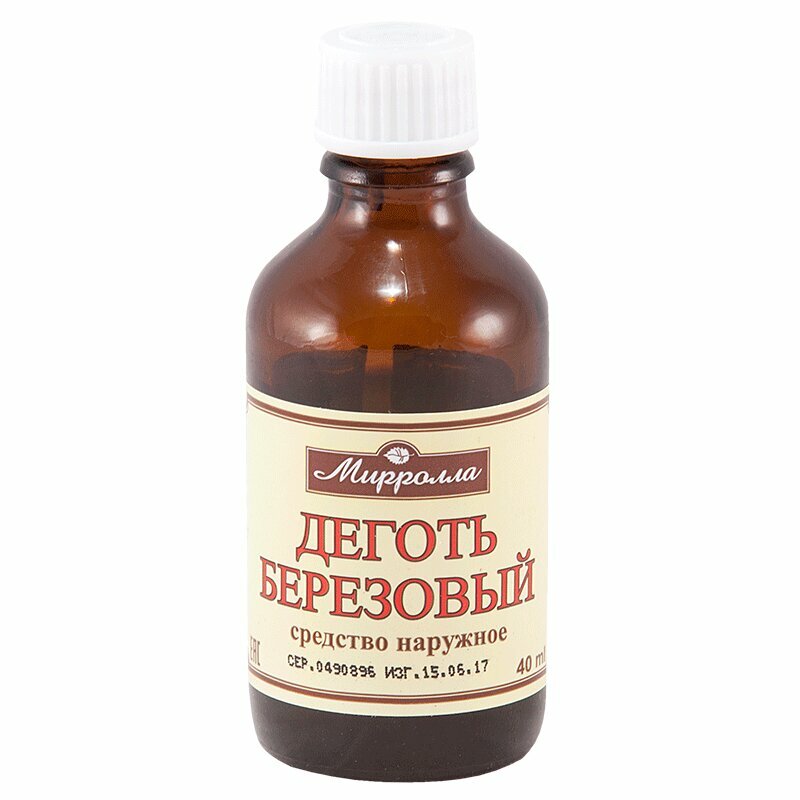 Мирролла березовый деготь 40 мл - натуральное косметическое средство, темная смолистая жидкость с ярко выраженным ароматом. Без ароматизаторов, без консервантов, без красителей, не содержит парабенов.