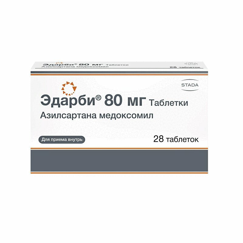 Специфический антагонист рецепторов ангиотензина II типа 1 (AT1). Азилсартана медоксомил является пролекарством. Быстро превращается в активную молекулу азилсартана, которая избирательно препятствует развитию эффектов ангиотензина II путем блокирования его связывания с рецепторами AT1 в различных тканях. Ангиотензин II является первичным вазоактивным гормоном РААС с эффектами, включающими вазоконстрикцию, сердечную стимуляцию, стимуляцию синтеза и высвобождение альдостерона, и, как следствие, почечную реабсорбцию натрия. Блокада рецепторов АТ1 ингибирует отрицательный регулирующий ответ ангиотензина II на секрецию ренина, но итоговое повышение в плазме активности ренина и уровня циркулирующего ангиотензина II не подавляет антигипертензивный эффект азилсартана. Антигипертензивный эффект азилсартана медоксомила развивается в течение первых 2 недель применения с достижением максимального терапевтического эффекта через 4 недели. Снижение АД после приема внутрь однократной дозы обычно достигается в течение нескольких часов и сохраняется в течение 24 ч. Синдром отмены (резкое повышение АД после отмены препарата) после внезапного прекращения приема при длительной терапии (в течение 6 мес) препаратом Эдарби® не наблюдался. Безопасность и эффективность применения препарата не зависят от возраста пациентов, но большая чувствительность к снижению АД у некоторых пациентов пожилого возраста не может быть исключена. Как и при применении других антагонистов рецепторов ангиотензина II и ингибиторов АПФ, антигипертензивный эффект менее выражен у пациентов негроидной расы (обычно популяция с низкой активностью ренина в плазме крови). У пациентов с диабетической нефропатией также не следует одновременно применять ингибиторы АПФ и антагонисты рецепторов ангиотензина II. Одновременное применение Эдарби® 40 мг и 80 мг с дигидропиридиновыми блокаторами медленных кальциевых каналов (амлодипин) или тиазидными диуретиками (хлорталидон) приводит к дополнительному снижению АД по сравнению с терапией антигипертензивными средствами, применяемыми в монотерапии (см. раздел "Лекарственное взаимодействие"). Влияние на процессы реполяризации Оценка потенциала препарата Эдарби® увеличивать интервал QT/QTc проводилась у здоровых добровольцев во время исследования QT/QTc. При применении препарата Эдарби® в дозе 320 мг увеличения интервала QT/QTc не отмечено. QTc - корригированная (относительно ЧСС) величина интервала QT, относительная величина. Т.к. длительность интервала QT зависит от частоты сердечного ритма (удлиняясь при его замедлении), для оценки она должна быть скорригирована относительно ЧСС. Удлинение интервала QT отражает неоднородность процессов реполяризации миокарда желудочков, и расценивается как независимый показатель, указывающий на возможность появления фатальных нарушений ритма сердца.