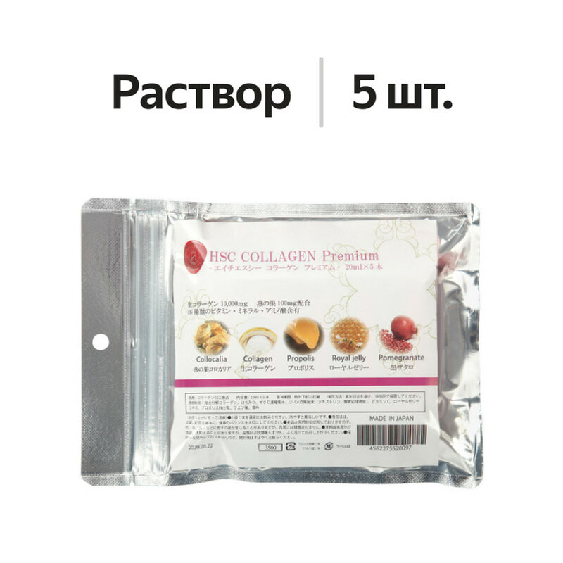 Бьюти-напиток высочайшего качества класса люкс. Эликсир для поддержания молодости, здоровья и хорошего самочувствия. Это интенсивный курс для омоложения, разработанный с использованием самых передовых японских технологий. Он содержит только натуральные, редчайшие высококачественные компоненты в высокой концентрации. Впервые использован свежий (сырой) морской коллаген, полученный из луциановых рыб из японского моря 10 мг (20%-максимальная концентрация). Одной из составляющих этого препарата является экстракт птичьего белого гнезда - ласточки салангана. Оно представляет собой кладезь ценных ингредиентов и является одним из самых дорогостоящих компонентов: полисахариды, белок, сиаловая кислота, факторы роста естественного происхождения. Не является лекарственным средством. Противопоказания: Повышенная чувствительность или аллергические реакции к любому из компонентов напитка. Применение: Принимать каждый день натощак за 30 минут до еды или через 2 часа после еды в течении 5 дней по 1 флакону (минимальный курс 10 флаконов). Можно принимать перед сном. Вскрыть флакон и выпить содержимое. После 5 дней приёма можно принимать по 1 флаконуодин раз в 2 дня. Рекомендовано повторять курс не менее 2-х раз в год. Состав упаковки: Флакон 20 мл - 5 шт