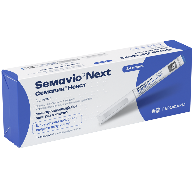 Препарат Семавик Некст показан к применению у взрослых в возрасте от 18 лет в дополнение к низкокалорийной диете и физической нагрузке для контроля массы тела, включая снижение и поддержание массы тела, у взрослых с исходным индексом массы тела (ИМТ), равным: ≥ 30 кг/м2 (ожирение), или