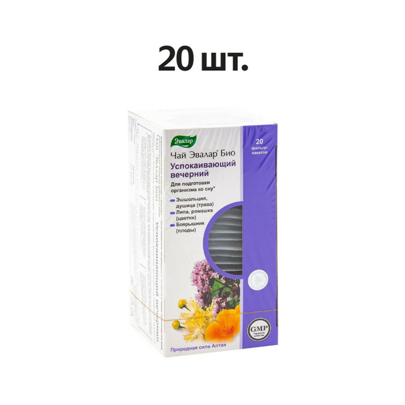 Чай Эвалар Био Успокаивающий Вечерний - биологически активная добавка (БАД) к пище, сочетающая в себе полезные свойства трав, которые помогут укрепить нервную систему и снять стресс, а также улучшить качество сна. Его формула содержит плоды боярышника, траву эшшольции, траву душицы, цветки ромашки аптечной и цветки липы, которые оказывают успокаивающее и расслабляющее действие на организм. Он выпускается в виде фильтр-пакетов весом по 2 г каждый, которые удобно использовать, в упаковке - 20 пакетов. Ценителям здорового образа жизни и натуральных компонентов мы рекомендуем купить чай Эвалар Био Успокаивающий Вечерний для того, чтобы подарить себе и своему организму моменты спокойства и благополучия.