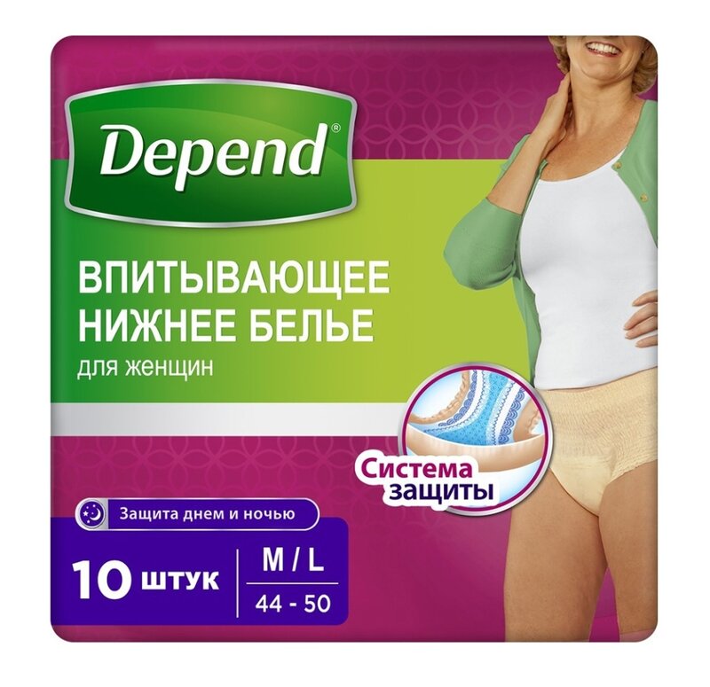 Впитывающее нижнее белье Depend для женщин (M/L, 10 шт) - это женские урологические трусы-подгузники, защищают в 5 раз надежнее, чем женская урологическая прокладка. Новое впитывающее белье Depend создано специально для женщин с учетом анатомических особенностей тела.