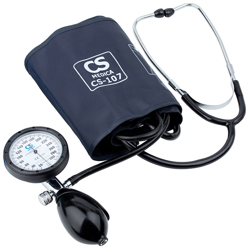 Механический тонометр CS Medica CS-107 со встроенным фонендоскопом и увеличенным манометром, совмещенным с грушей.