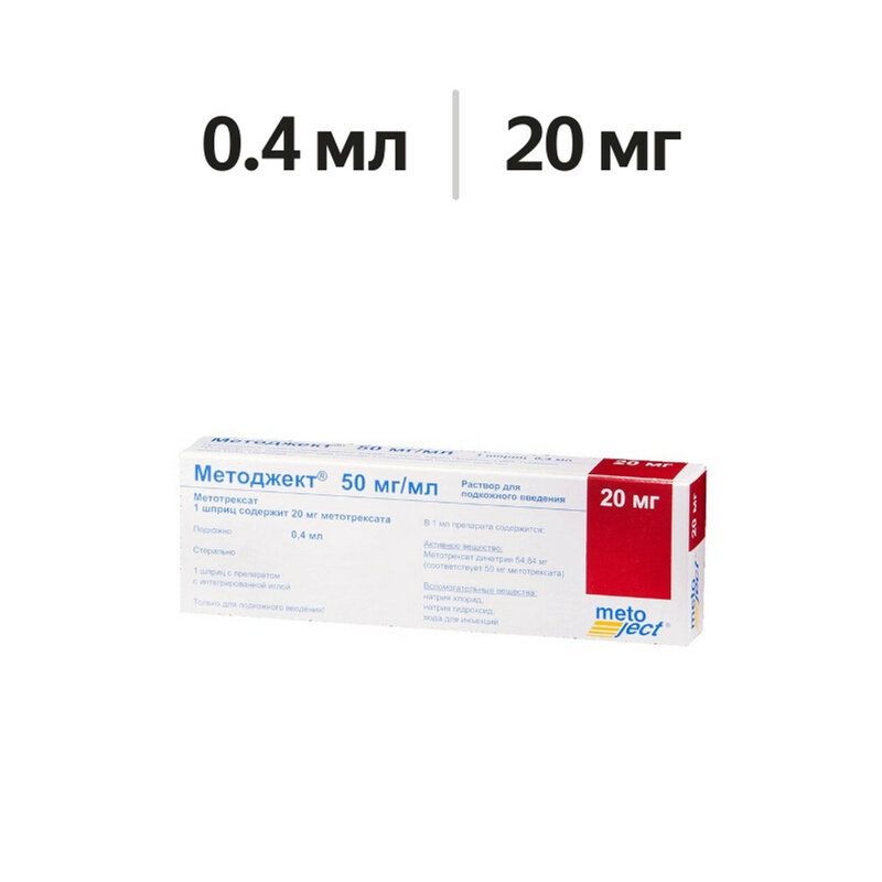 П/к. Интегрированная в шприц игла предназначена только для п/к введения препарата Методжект®. Методжект® не следует смешивать с другими лекарственными препаратами. Препарат должен назначаться врачом, имеющим опыт применения и знакомым со свойствами метотрексата и особенностями его действия. Препарат предназначен только для однократного применения. Методжект® применяют 1 раз в неделю. Пациент должен быть ясно проинформирован об однократном еженедельном режиме введения. Рекомендуется назначить для введения конкретный день недели. У пациентов с дополнительным Vd (наличие асцита, плеврального выпота) скорость выведения метотрексата из организма снижена. У таких пациентов необходимо особенно тщательно проводить контроль токсичности, снизить дозу препарата, а в некоторых случаях — прервать лечение. Взрослые пациенты с ревматоидным артритом. Рекомендуемая начальная доза — 7,5 мг метотрексата 1 раз в неделю. В зависимости от активности заболевания и переносимости метотрексата больным доза может быть постепенно увеличена (по 2,5 мг/нед). Максимальная доза при лечении ревматоидного артрита, как правило, не должна превышать 25 мг/нед. При этом повышение дозы метотрексата до величин более 20 мг/нед может сопровождаться существенным увеличением токсичности, в первую очередь — подавлением функции костного мозга. Ответ на лечение обычно наступает через 4–8 нед после начала применения препарата. После достижения желаемого ответа следует начинать постепенное снижение дозы до наиболее низкой эффективной поддерживающей дозы. Дети до 16 лет с полиартритной формой ювенильного хронического артрита. Рекомендуемая доза составляет 10–15 мг/м 2 1 раз в неделю. В случае недостаточной эффективности лечения доза может быть увеличена вплоть до 20 мг/м2 1 раз в неделю. При увеличении вводимой дозы необходимо увеличить частоту проводимых обследований больного. Пациенты с ювенильным ревматоидным артритом должны наблюдаться ревматологом-специалистом по лечению детей и подростков. Пациенты с псориазом и псориатическим артритом. За неделю до начала лечения рекомендуется ввести парентерально тест-дозу 5–10 мг метотрексата для выявления возможных реакций непереносимости. Рекомендуемая начальная доза — 7,5 мг метотрексата 1 раз в неделю. Дозу следует постепенно увеличить, при этом максимальная доза не должна превышать 25 мг/нед метотрексата. Применение доз свыше 20 мг/нед может сопровождаться значительным увеличением токсичности, в первую очередь подавлением функции костного мозга. Ответ на лечение обычно наступает через 2–6 нед после начала применения препарата. После достижения желаемого ответа доза должна быть постепенно снижена до наиболее низкой эффективной поддерживающей дозы. В исключительных случаях, когда это клинически оправдано, могут применяться дозы свыше 25 мг, однако при всех случаях не более 30 мг/нед ввиду резкого увеличения токсичности. Особые группы пациентов Дети. Использование препарата Методжект® у детей до 3 лет не рекомендовано из-за недостаточности данных об эффективности и безопасности использования препарата у этой группы пациентов. Почечная недостаточность. Методжект® должен применяться с осторожностью. Дозу, в зависимости от значения Cl креатинина, следует скорректировать в соответствии со следующей таблицей. Нару