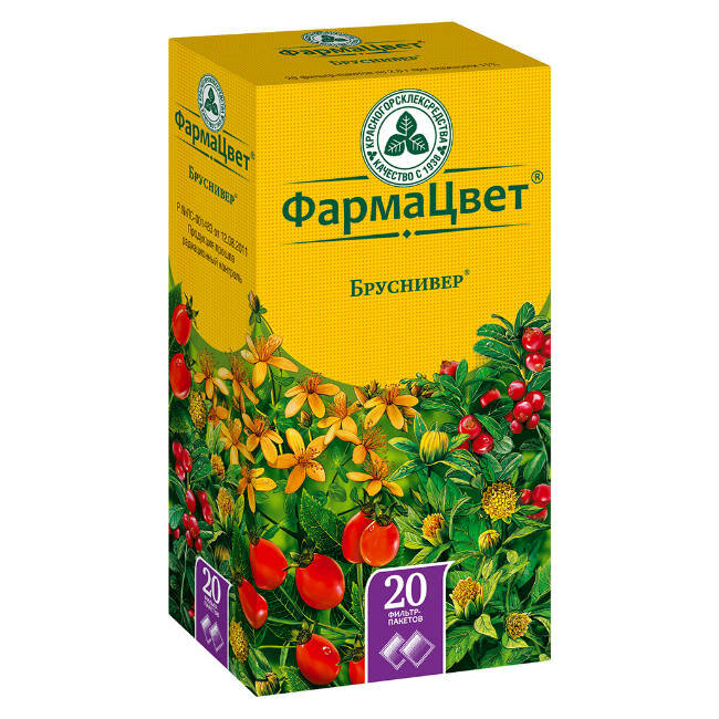 100 г сбора содержат смесь брикетированного лекарственного растительного сырья: «бруснивер» — травы череды 10%, плодов шиповника и травы зверобоя по 20%, листьев брусники 50%.